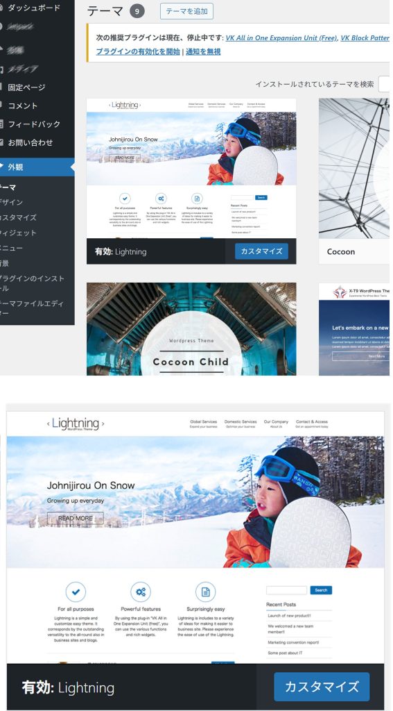 左上図は、管理画面の「外観」>「テーマ」でいくつかテーマが表示されているところです。下は「Lightning」をテーマとして選んで、有効化したところです。